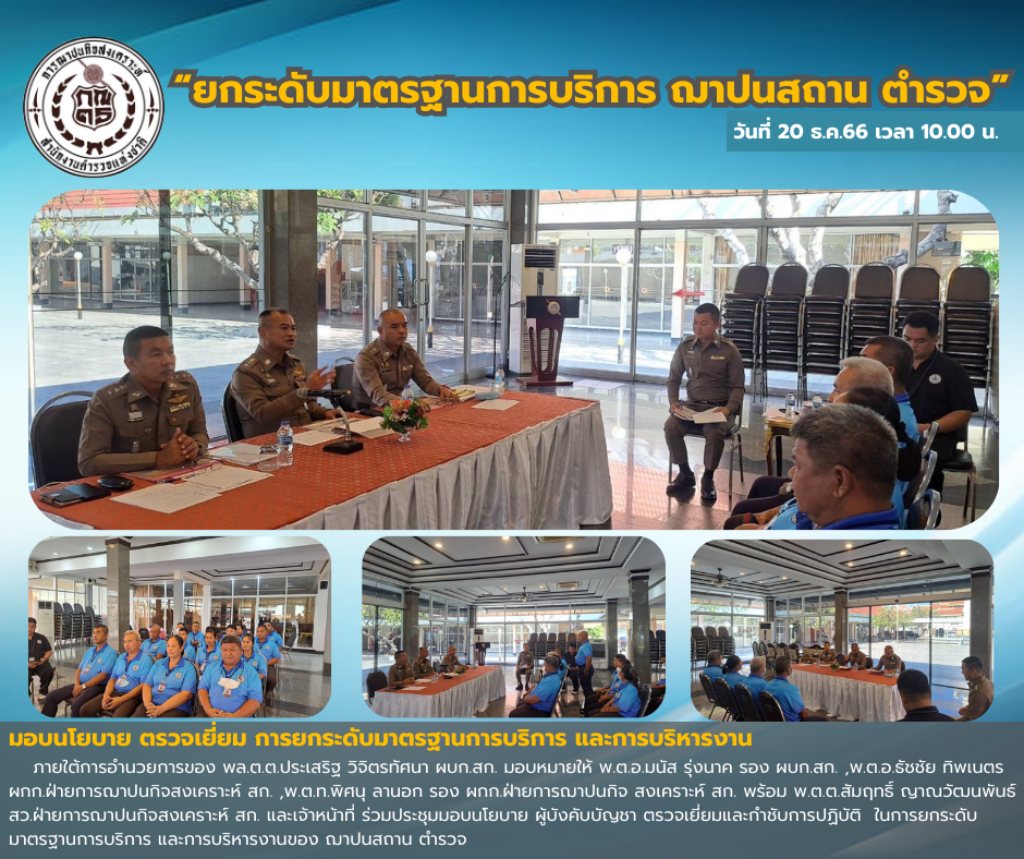 เมื่อวันที่ 20 ธ.ค.2566 เวลา 10.00 น. พล.ต.ต.ประเสริฐ วิจิตรทัศนา ผบก.สก. มอบหมายให้ พ.ต.อ.มนัส รุ่งนาค รอง ผบก.สก. ประชุมมอบนโยบาย ของผู้บังคับบัญชา และตรวจเยี่ยมกำชับการปฏิบัติหน้าที่ และมอบนโยบายข้อสั่งการเกี่ยวกับการยกระดับมาตรฐานการบริการฯ 25 ธันวาคม 2566